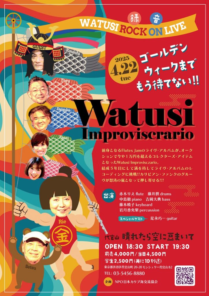 【出演】Watusi Improvisczario : 赤木りえ(Flute)、藤井摂(Drums)、中島徹(Piano)、吉岡大典 (Bass)、藤本暁子(Keybords)、岩槻香央梨(Percussion) Special Guest : 是永巧一(Guitar)