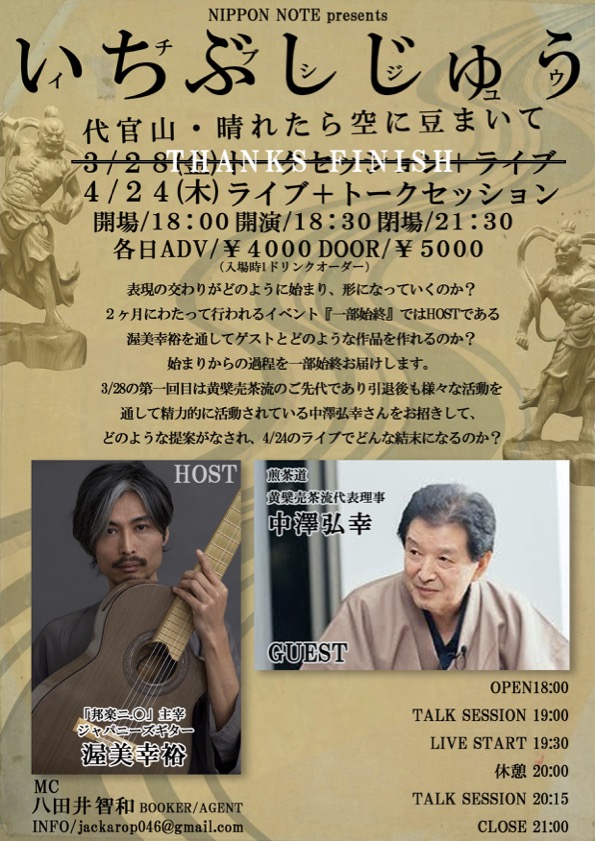 [出演] GUEST:中澤弘幸(黄檗売茶流 御先代)HOST/LIVE:渥美幸裕(邦楽二.○主宰/JAPANESE GUITAR)MC:八田井智和(BOOKER/AGENT)