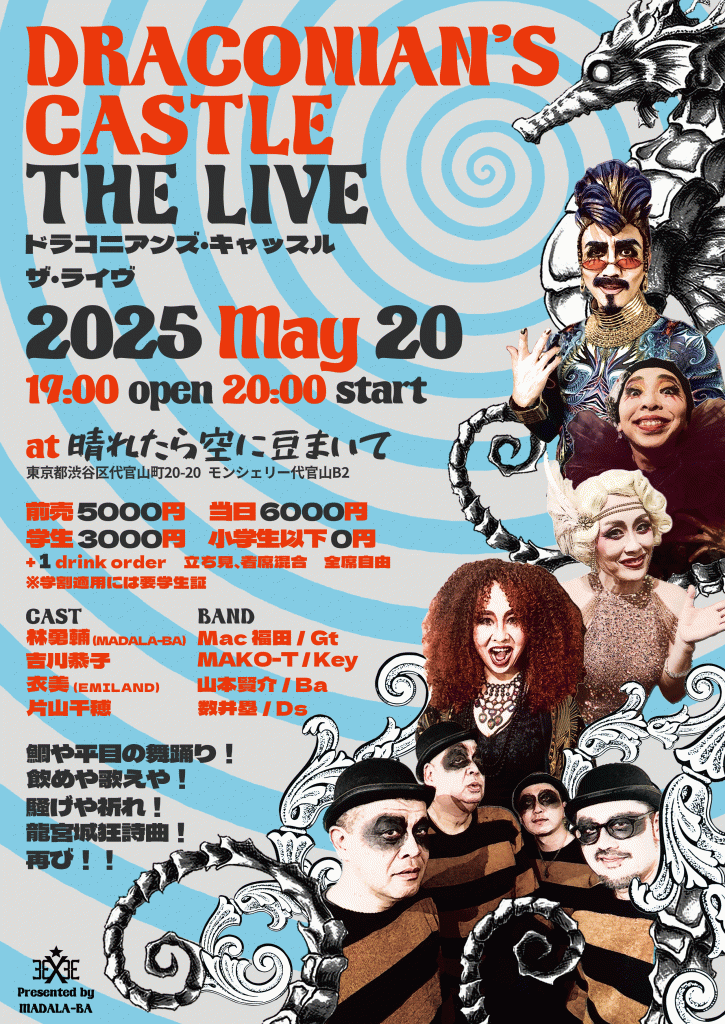 [出演]【CAST】林勇輔(MADALA-BA)、吉川恭子、衣美(EMILAND)、片山千穂【BAND】Mac福田/Gt、MAKO-T/Key、山本賢介/Ba、数井塁/Ds
