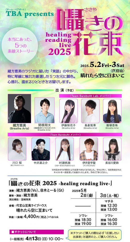 [出演] 緒方恵美/目木とーる/関根翔太/伊藤梨花子/島倉凱隼/飯塚 杏珠/川口 桜/中沢 凜之介/村瀬 帆南/伊月 登宇聖/長谷川 愛鈴