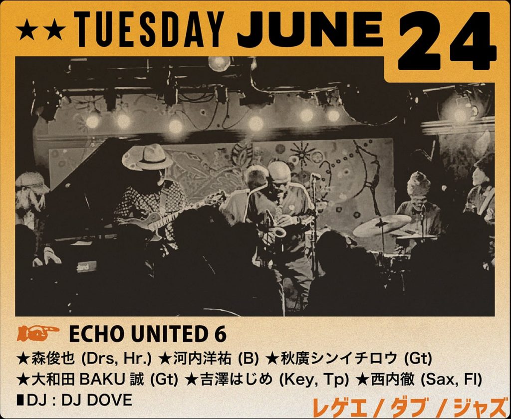 マルチ演奏家であり名ドラマーである森俊也。幼少時から音楽教育を受け、武蔵野音楽大学器楽学科に入学、フレンチホルンを専攻。在学中にキーボード奏者としてセッション活動を始める。マルチに楽器を操りスカ、ロックステディ、ルーツ、ダンスホール等のシーンで瞬く間に頭角を現し、多くの熱烈なファンを生んできた。ECHO UNITED 6はそんな森俊也の呼びかけで、ワンドロップ、ダウンビートシーンのファーストコールが豪華に勢揃いしたまさに凄腕集団。スカ、ロックステディ、ルーツ、ダンスホールなどの様々なジャマイカ音楽をベースに、ジャズもエレガントに香る唯一無二のバンドサウンドは、どこまでも生々しくエキゾチック。ダビーでジャジーという「音」の桃源郷。ここにしかない音楽が鳴っている。DJは大阪SOCORE FACTORYの名物パーティ、BLOWIN’ IN THE WINDを主宰するDJ DOVEが登場!